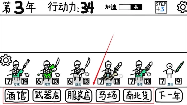 2、酒馆用来招募成员,武器店购买武器,服装店购买护甲,马场则是购买马匹,还有南北货则是购买补给。