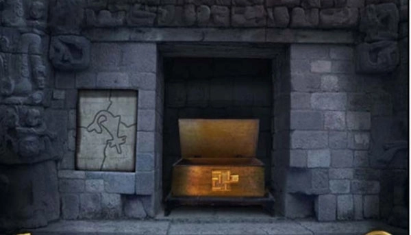 19、来到场景29,用锤子敲碎瀑布,进入场景34,依照记录的图形解开墙壁上的谜题,打开场景37的石门。