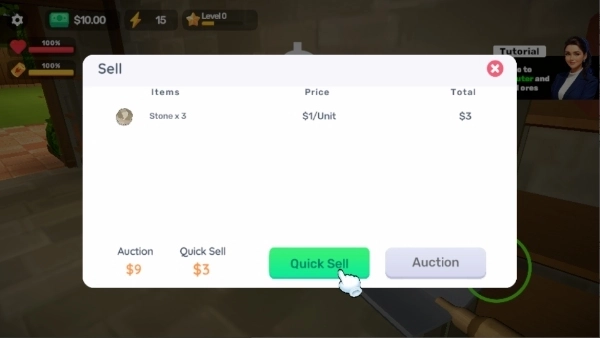 6、经济循环系统-卖出矿产获得资金,用于升级工具或竞拍新地块,实现财富滚雪球。