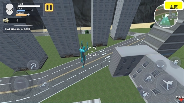 3、屏幕左侧配备虚拟摇杆用于控制角色移动方向,右侧则设有绳索发射与加速冲刺按钮,灵活使用可实现空中摆荡、快速位移等高阶操作。