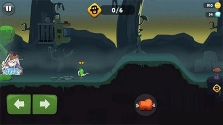 4、找到隐藏有鸡腿的泥坑,点击图标投放诱饵。稍作等待,僵尸便会现身。此时迅速点击捕捉工具,成功抓住僵尸。点击向上箭头可以让角色快速移动。