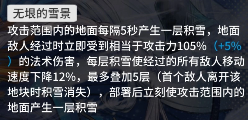 该天赋生成的积雪只能出现在可通行的地面上,并且会在圣聆初雪退场后消失。当敌方单位的中心碰撞箱踏入被积雪覆盖的区域时,会受到相当于1.05倍攻击力(未计入模组天赋1076)的法术伤害。减速效果最多可叠加至60%,且在首个敌人离开后积雪就会消失。实际使用时,先进入积雪范围的敌方单位在5秒内受到的减速效果,会比后进入的敌方单位更强,这样能让敌人聚集到一起,从而提升单格积雪的利用效率。这个天赋逻辑自洽,还补充了模板原本缺失的常态输出能力(输出甚至比罗哥还要强),既有控制效果又有不俗的伤害,数值表现都很出色,相当于其他干员两个天赋加起来都比不上这一个天赋的强度。