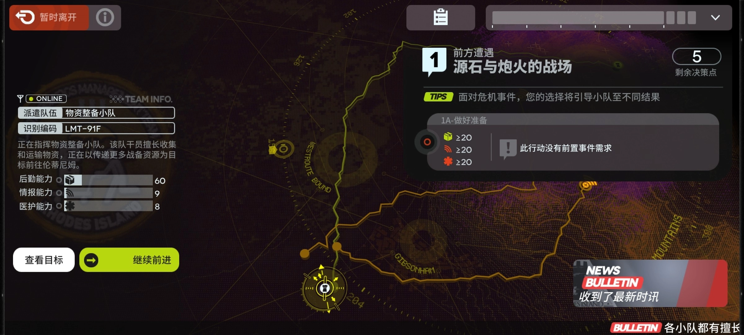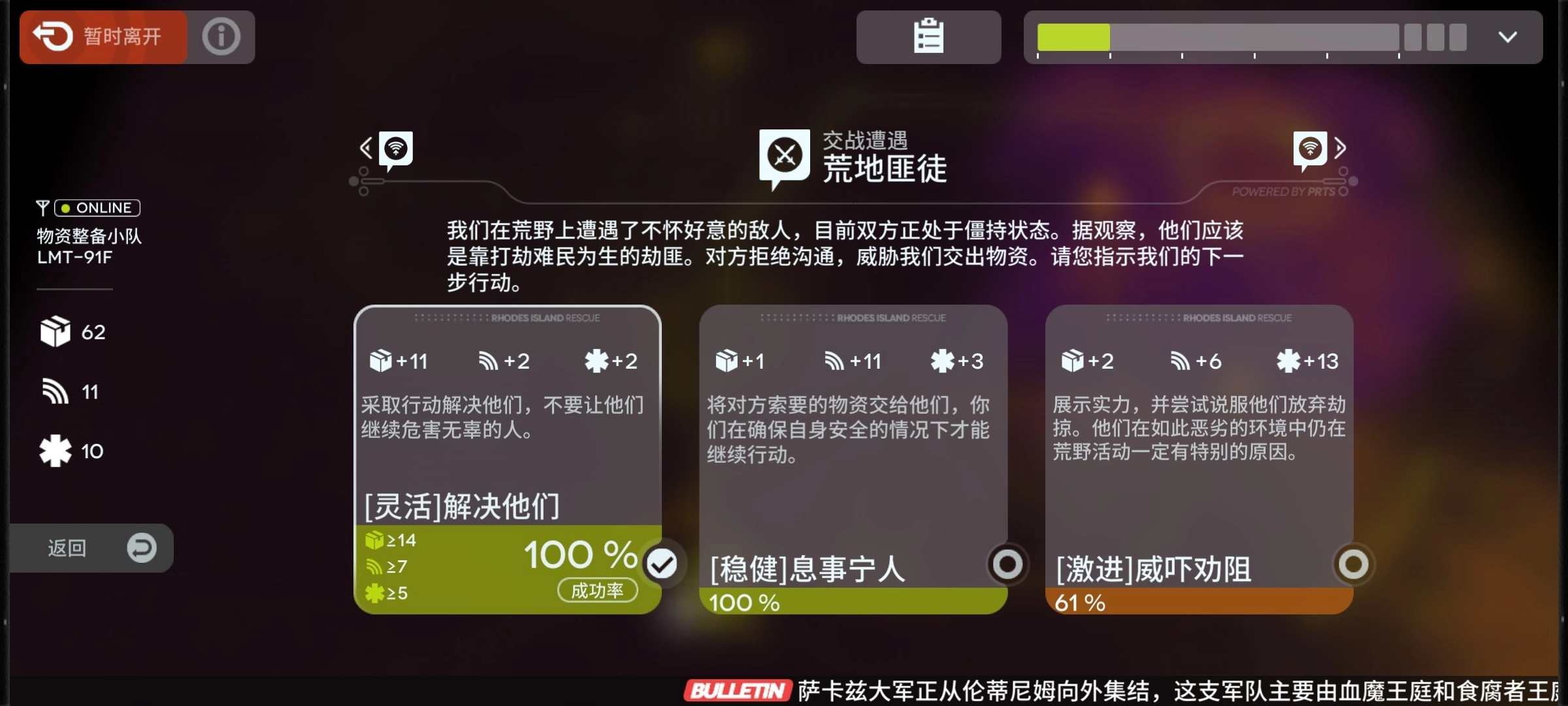 b中间选择:主要也分为三类,战斗任务和情报任务和救援任务,分别对应物资,情报,救援值较高时容易成功(成功率也就是自身三项数值和任务三项数值相比而取得,高则100%,差越多越低,点击任务有下家可显示要求)