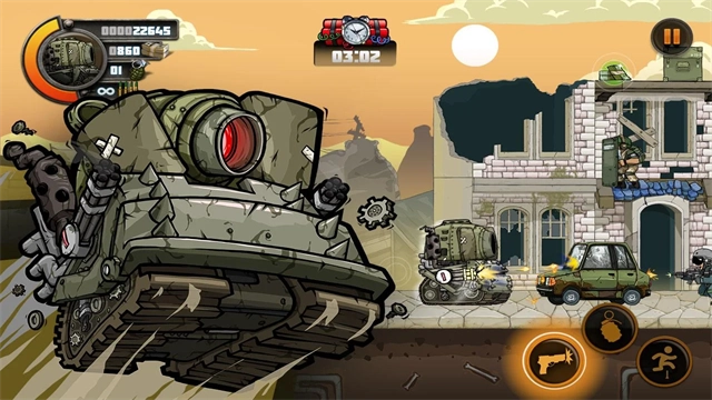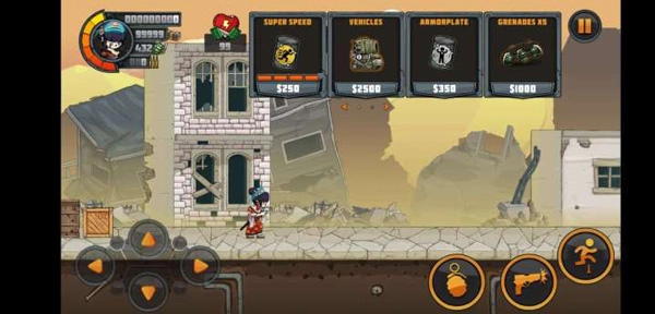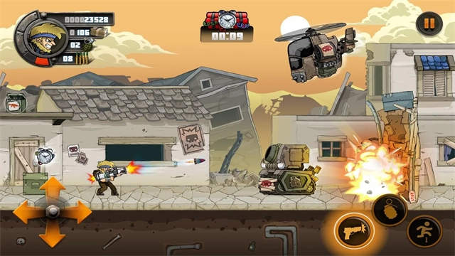 2、进入关卡后,可通过左侧方向键操控角色移动,右侧按键用于控制角色跳跃与攻击,借助不同类型的枪支和手榴弹能够更迅速地消灭敌人。