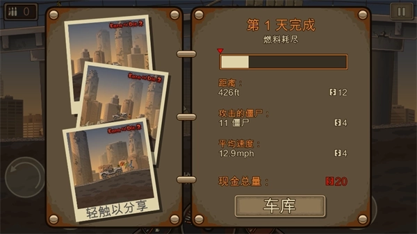 3、多多升级。游戏中玩家们及时失败了也可以获得金币,金币可以让我们对汽车进行升级,如提高汽车的加速、防御能力等等,还可以在汽车上配置武器从而将僵尸们消灭在远处,而这些装备对于玩家们过关来说无疑是最重要的了。