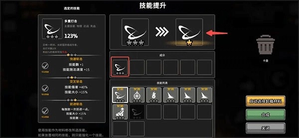 游戏进行到后期,获得的技能卡数量会逐渐增多,那些暂时用不上的技能卡,我们可以点击界面上的‘+’号进入技能升级强化页面,把它们当作‘狗粮’喂给需要提升等级的技能卡。