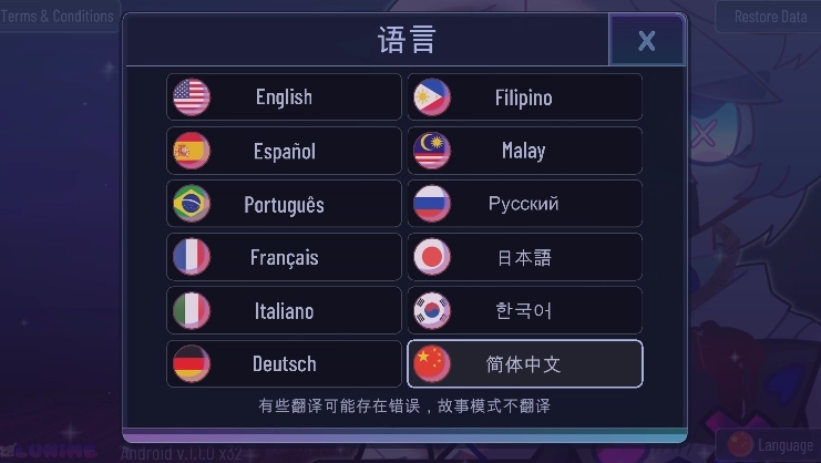 1、在进入游戏的界面,点击右下角的“language”。