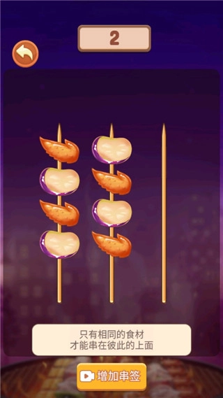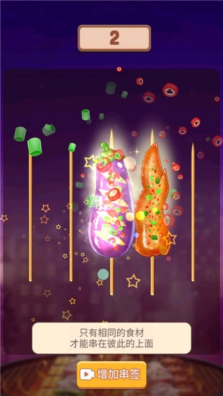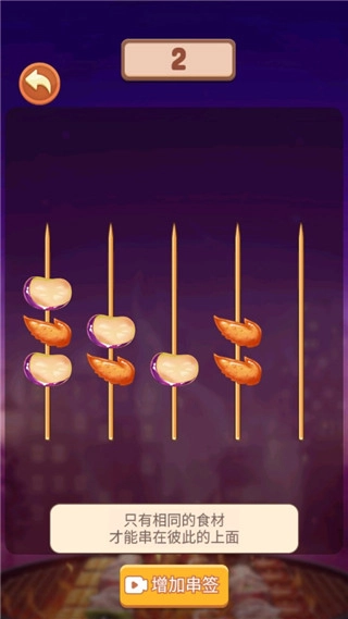 只有相同的食材才能串在彼此的上面,玩家可以增加串签;