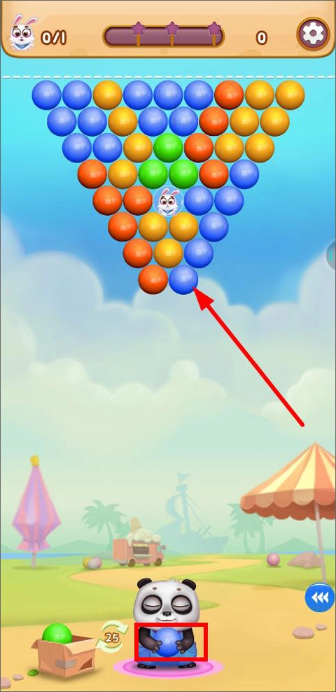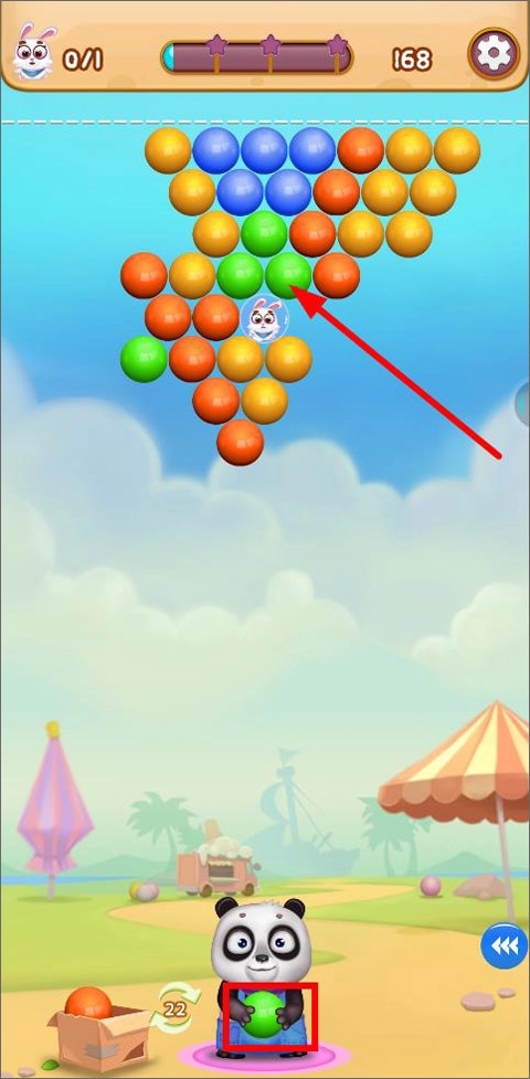 在游戏里得操控萌熊,把相同颜色的球体打下来,这样才能解救兔子。