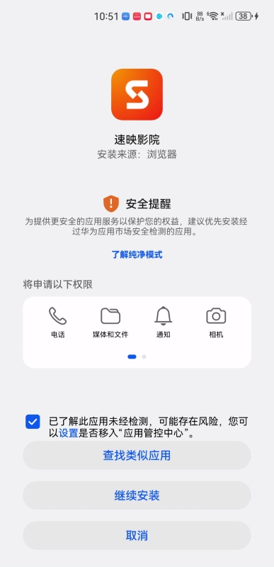 接下来勾选“已了解此应用未经检测……”这一项,然后点击“继续安装”按钮。另外,也可以点击查看纯净模式的相关信息。