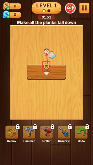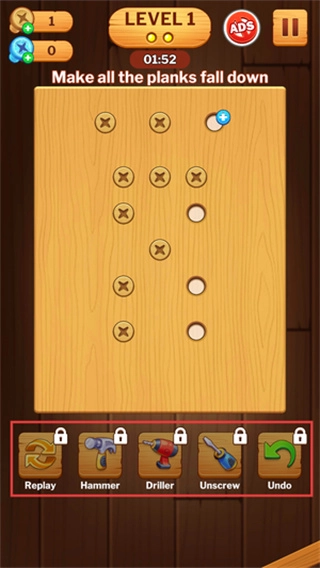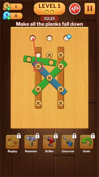 拿起螺丝刀,点击并拧下木板上的螺丝,然后把螺丝拖动到上方对应的空位里,就像在玩拼图一样。