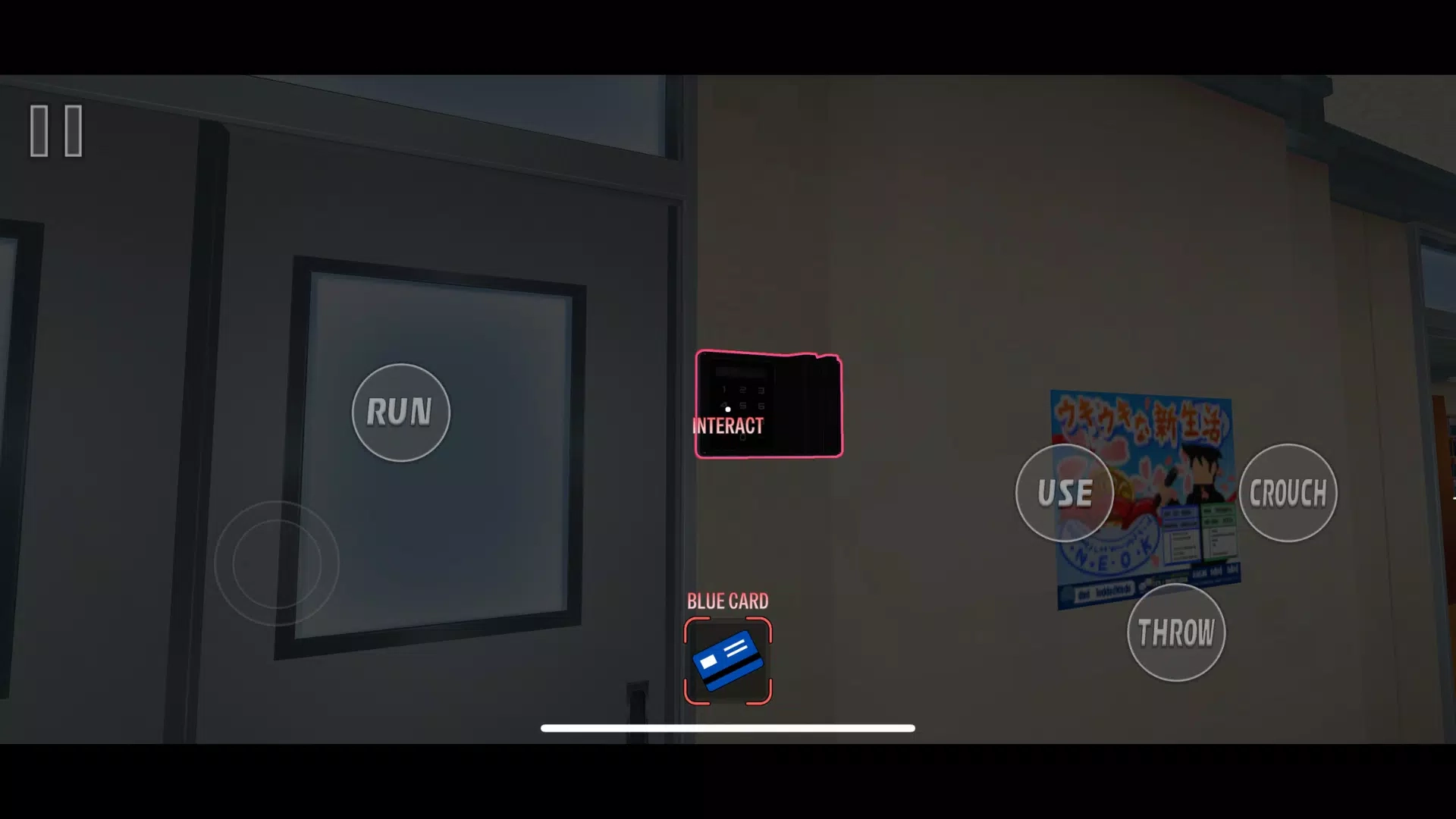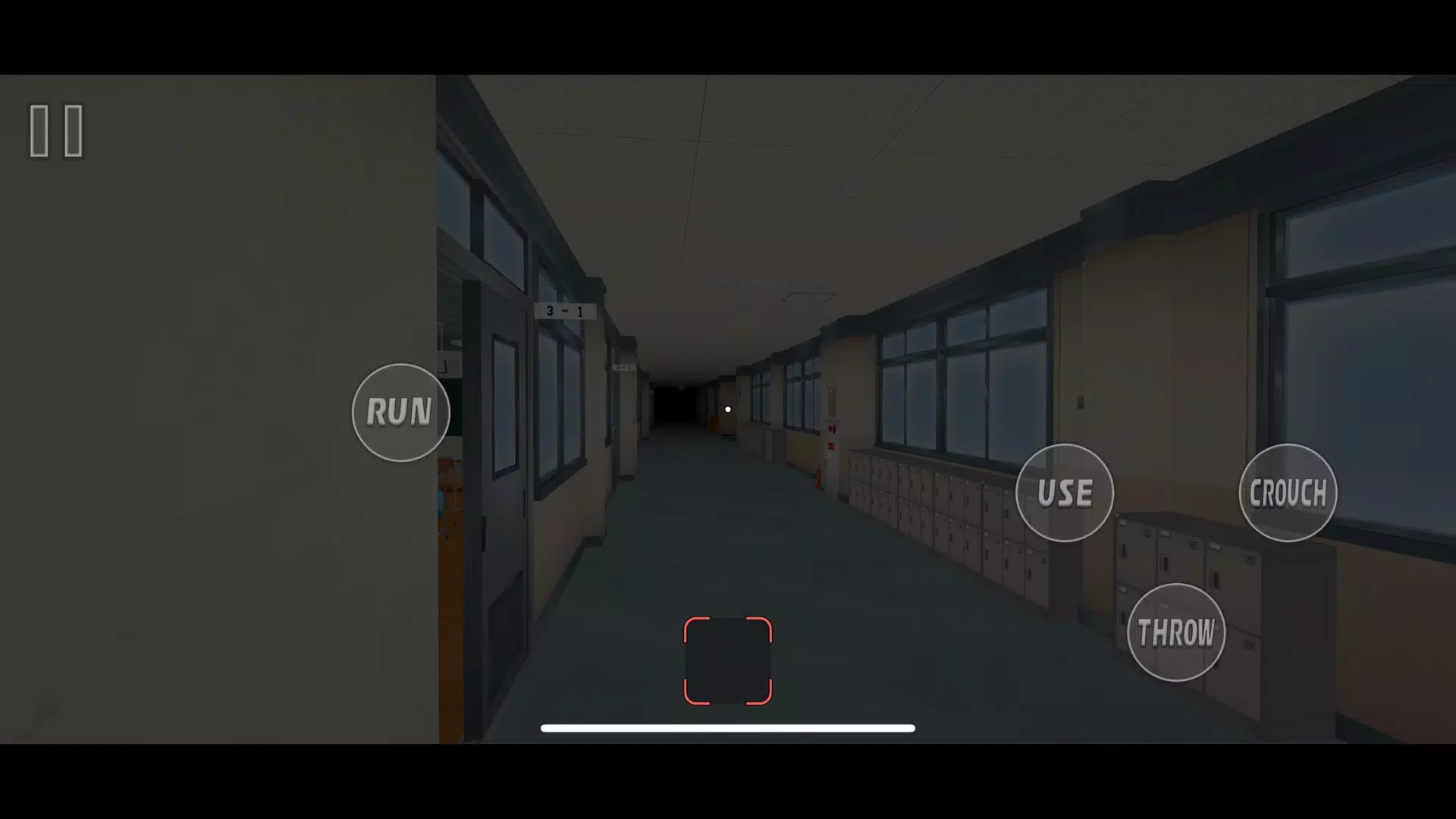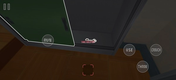 3、游戏采用第一人称视角,角色移动由左侧虚拟轮盘操控,设有RUN奔跑键、USE拾取互动键以及CROUCH蹲下键。