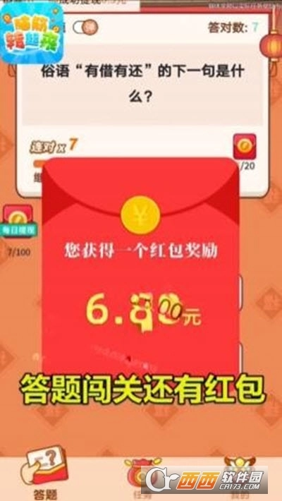 这款趣味答题闯关软件,画面制作精细,玩法设计简单易懂。玩家需要依据给出的提示,持续开动脑筋、运用思维来完成闯关挑战,通过解答出最终答案,就能顺利赢取奖励,体验超有趣的益智答题领红包乐趣。