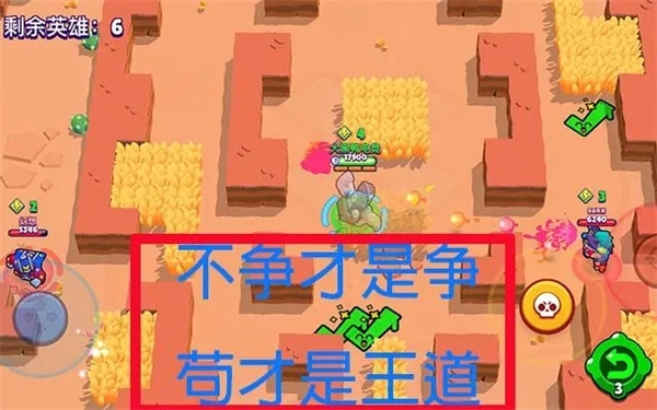 拿到能量块后,要找个合适的草丛藏起来,核心区域附近通常是最佳选择。要是碰到其他对手,可以适当通过转圈的方式和解,但必须始终保持安全距离和安全血量!