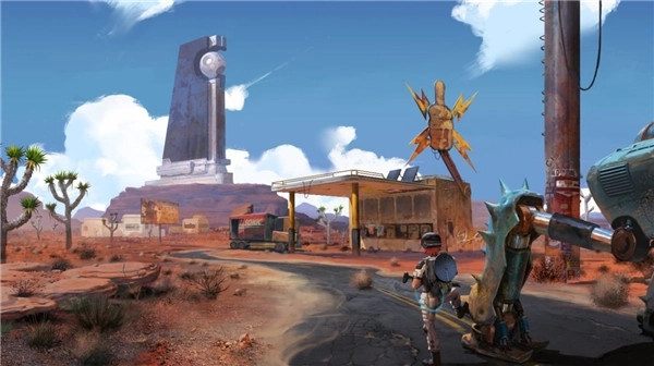 游戏里人物、武器和载具的设定特别吸睛,每个元素都带着浓郁的废土味儿:一眼望不到头的黄沙和充满科技感的建筑交织,鲜亮饱和的色彩配上厚重的美式漫画风格,辨识度拉满。