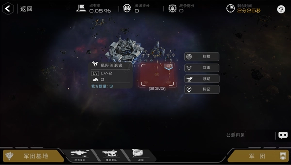 我们留意到空间机库的左下方新增了几个阵型按钮,不妨先选用1号阵型,在前三个位置部署肉盾,后三个位置安排输出。完成编队配置后就能启动进攻,点击空白地块会展示该地块的详情,我们先将编队移动过去,抵达目标点后即可点击发起攻击。