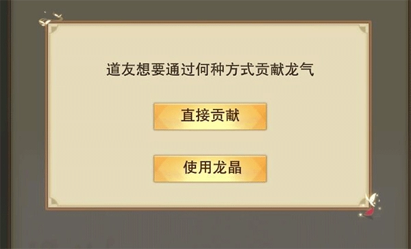 除了直接拿出自身10%的龙气贡献外,各位道友还能通过捐献龙晶的途径来为宗门增添龙气,每颗龙晶能够提升2点龙气。