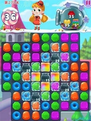 冰块障碍会将内部的糖果冻住,导致糖果无法移动和交换。玩家需要和冰块里的糖果进行匹配消除,以此来破坏冰块。
