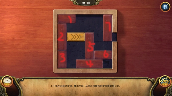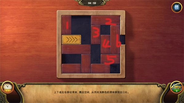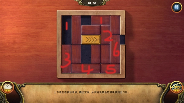 3、先上移1号木块,随后让3号木块向右滑动、2号木块下移,再将5号木块与黄色木块一起向右推进;接下来依次上移4号木块、上推2号木块、左移3号木块,最后让2号木块下移即可完成解谜。