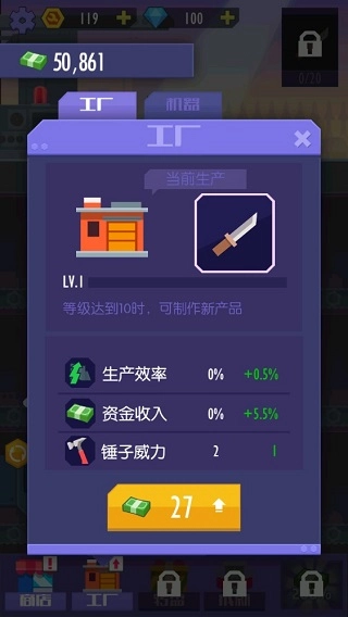 随着资产增长,持续点击屏幕容易让手指疲劳,这时自动化生产系统就能派上用场:玩家可在商店开宝箱获取机械装置,解锁机器槽位并安装自动化设备。这不仅能解锁更多新产品线,收益也会显著提升。
