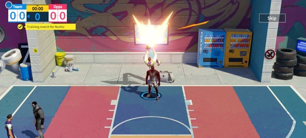 《全明星街球派对》的场地大小是标准篮球场的一半,在攻防转换的时刻,场地上的三分线会通过闪烁来给出提示,要是球员没有踏出三分线,就没办法发起进攻。