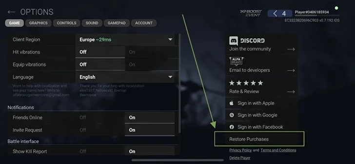 2、打开“Options”菜单,找到并点击“RestorePurchases”按钮,就能恢复已购买的内容了。