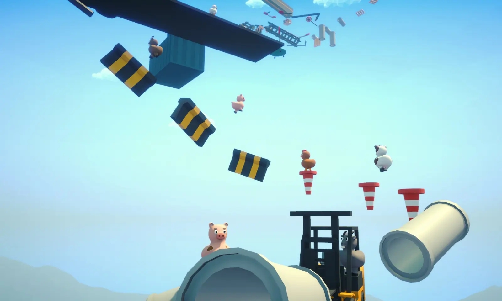 2、物理引擎模拟真实互动,角色可骑乘、拖拽、抛掷队友,过程中充满意外喜剧效果,如误将队友抛下悬崖或共同挂在树枝上尖叫。