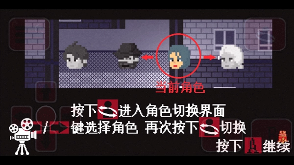 最后一项新手引导最重要:就是角色互换,主要有四种角色,每一个角色触发的剧本都不一样,要想知道游戏最终的真相,需要时不时地切换游戏角色,如果想切换角色,只要点击图片显示的角色切换按钮,然后按左右键选择你要切换的角色,选好后再按钮角色切换按钮即可切换成功。