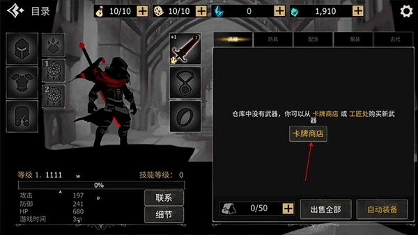 2、能看到我们背包里没有武器,接着会提示我们前往卡牌商店