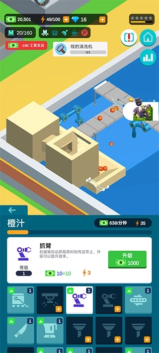 1、进入游戏后,玩家能够借助升级各个车间里的机器,来提高生产的速率;