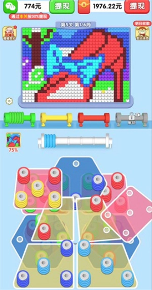 你需要点击不同颜色的毛线来绘制出关卡所需的图案,通过消除这些毛线达成目标,收集各色毛线获取不同奖励,持续闯关收获更多奖励,消除更多毛线体验最有趣的游玩过程。