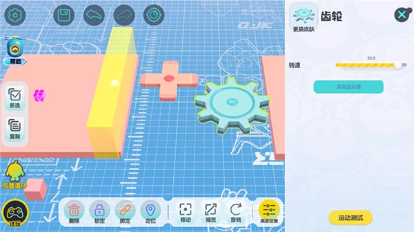 【机关组件】的详情界面中可以调整该组件的运动及其他属性参数,不同的机关会有不同的参数可以调整(比如齿轮可以调整转速)