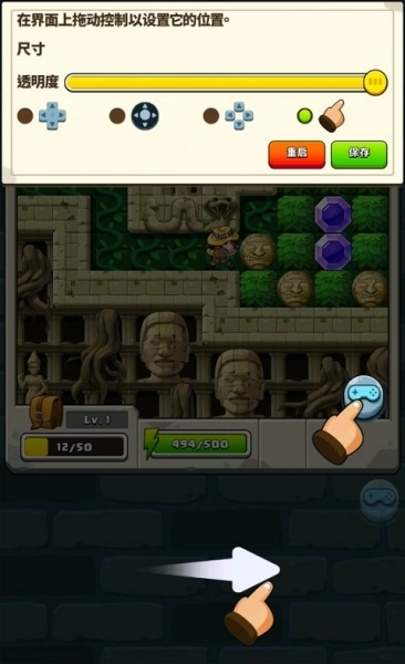 6、这里就是你的能量所在,当你使用能量把巨石推回检查站时,要尽量避开现金、蛇这类东西,它们会消耗掉你大量的能量。
