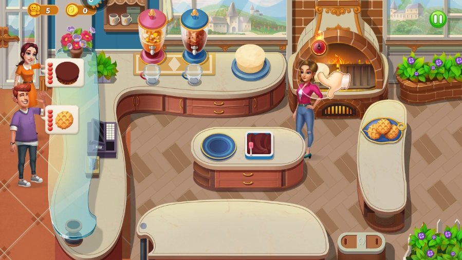 接着点击桌上的可可粉完成撒粉操作,顺便还能把邻座顾客需要的饼干一起递过去。