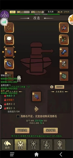 2、洗炼:洗炼是该游戏的一大特色,武器和项链可洗出幸运属性,游戏内触发幸运攻击时,伤害为正常伤害的1.5倍,每点幸运能提升5%的触发概率,当幸运值超过20点后,每增加1点幸运还会额外提升5%的伤害;除这两件装备外,其他装备需洗出“全技能+1”的属性,建议多收集等级低于30级的装备,且当装备洗出三个橙色属性后进行回收,将返还全部洗炼石。