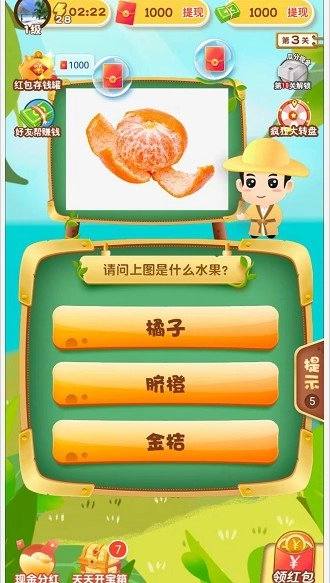 这是一款融合答题闯关与现金奖励的趣味游戏,所有题目均围绕水果设计,玩家只需精准辨认水果类别就能通关,既轻松又好玩。