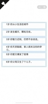 5.游戏进行时,持续点击屏幕来进入下一个年龄阶段,留意角色的成长变化和遇到的各类事件,等人生环节结束后,点击“人生总结”就能查看游戏的最终结果。