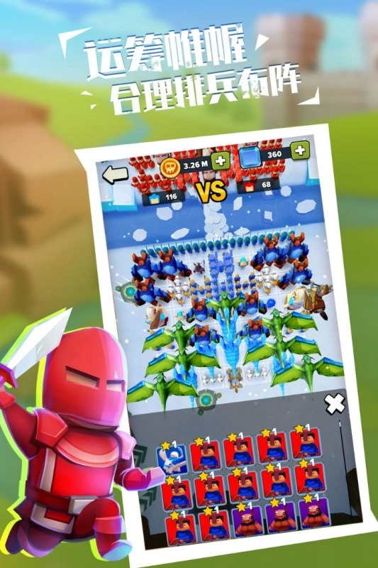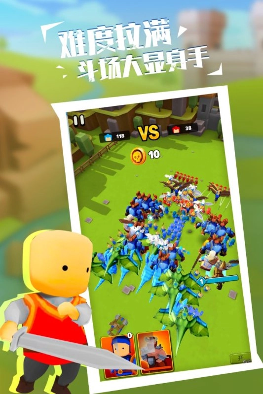 《军团大战》是一款迷你型军事战略,采用竖屏战斗界面设计,方便玩家单手操控。卡通风格的画面精致可爱,适合更广泛的年龄层体验。游戏核心玩法融合了放置与闯关元素,玩家在每场战斗前可根据敌方阵型调整兵力部署;战斗过程中,点击屏幕空白区域还能持续召唤援军。海量精心设计的关卡带来不同挑战,后续关卡更有宝箱奖励和新兵种解锁等你探索。目前游戏中提供10位各具特色的英雄以及超过20种兵团可供选择,合理搭配英雄与兵种,将帮助你应对更高难度的挑战。此外,除了基础的闯关模式,还包含扩张战斗、多人联机等多种玩法,现在就召集你的英雄,组建属于你的无敌军队,踏上统帅之路吧!