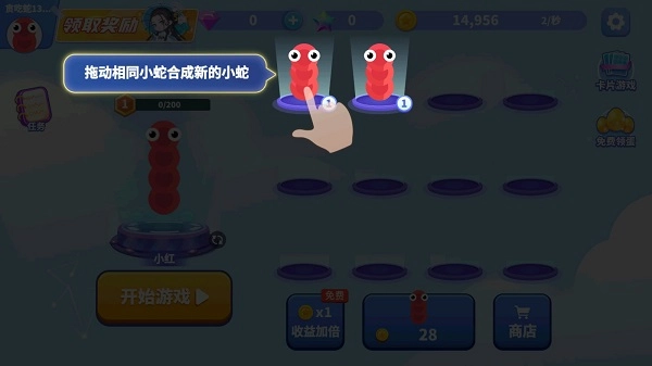 想收集各式各样的小蛇吗?只需轻轻滑动手指,将相同的小蛇合并,就能解锁更多更厉害的蛇蛇啦。