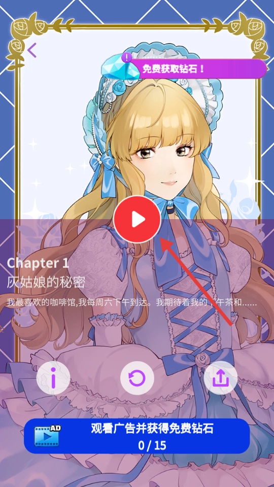 进入灰姑娘的秘密章节,可点击播放按钮推进剧情,还能通过观看广告获取免费钻石,助力玩家游戏进程。