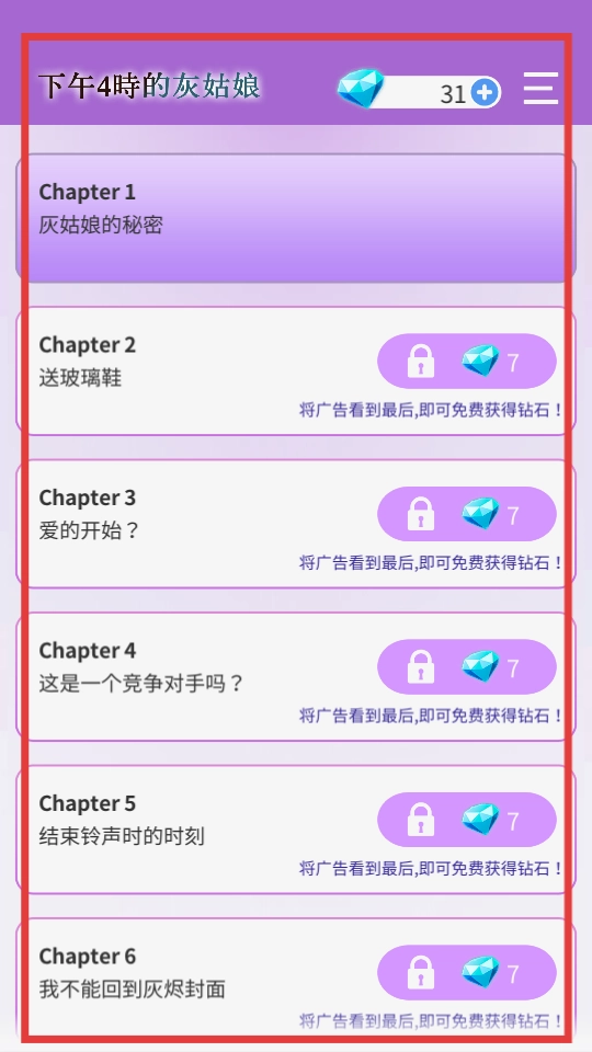 完成第一章节后会进入章节选择界面,除第一章外后续章节需观看广告到最后获取钻石解锁,集齐钻石就能开启新章节体验新剧情。