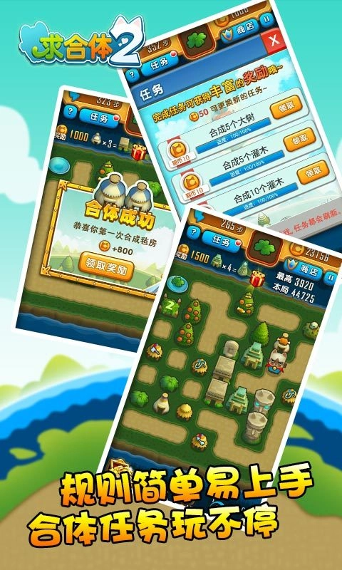最佳三消游戏《求合体1》的正统续作,玩法延续前作核心机制:通过种植小树合成大树,再由大树合成木屋,以经典三消玩法为基础展开游戏。