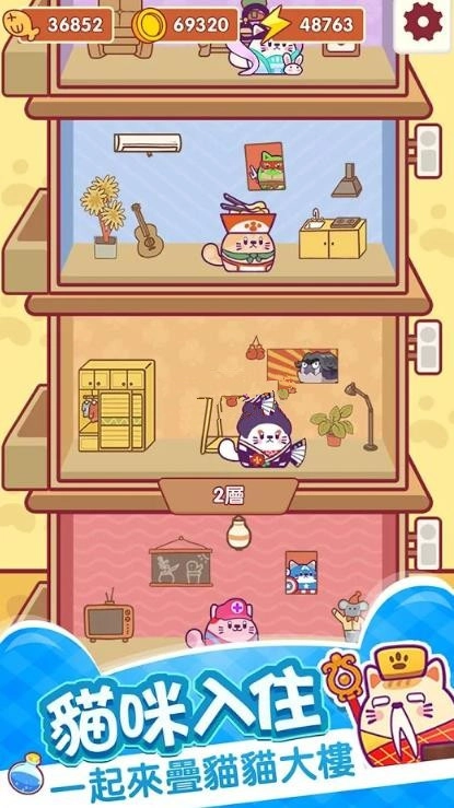 3、你需要拓展猫咪的乐园,给你最紧张刺激的消除,很烧脑的小游戏,新更多的猫猫过来,让大楼越来越高。
