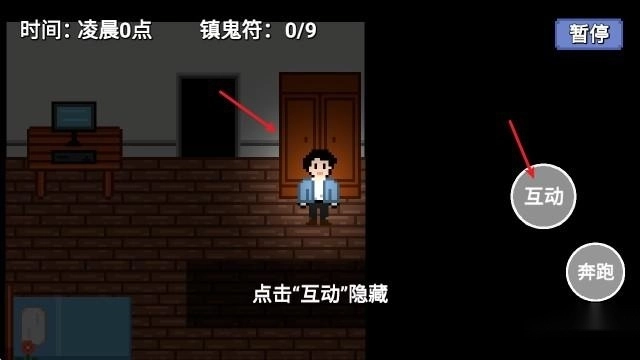 3、靠近柜子后,可点击互动按钮躲入其中,以此避开女鬼的追杀。