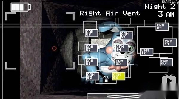 有那么个憨憨,总爱从右侧通风口发起进攻。要是你通过闪灯察觉到它在管道口,得马上戴上头套——电脑版的话,它会进到保安室里查看你;手机版的话,戴头套两三秒就能把它骗走,它不会进保安室,你还能听到它离开时“嗵嗵”的声响。要是没及时戴头套,它就会像一代那样,待在右管道里不挪窝,等你下次开监控的时候就会跳杀。