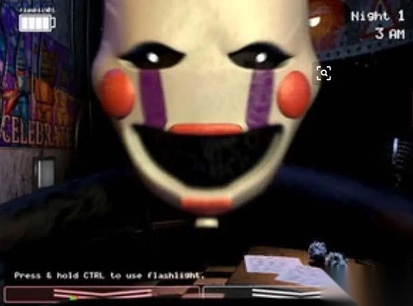 一个浑身破损的玩偶,每次移动都会发出信号干扰的杂音,它会经过正门,但正门处没有危险。要是你在右管道闪灯时看到它,得立刻戴上头套;听到噪声和咚咚声(大概)就说明它离开了。要是没及时戴头套,或者在它出现时打开了监控,它就会爬到天花板上。一直戴头套能推迟它扑过来的时间,可终究躲不过去,你还能上几次发条。不过要是时间还没到5点,还是退出去吧。