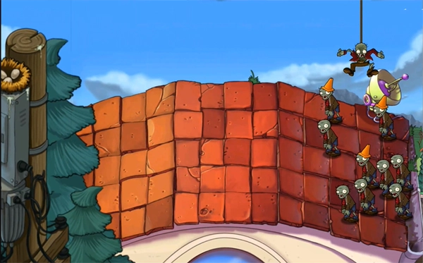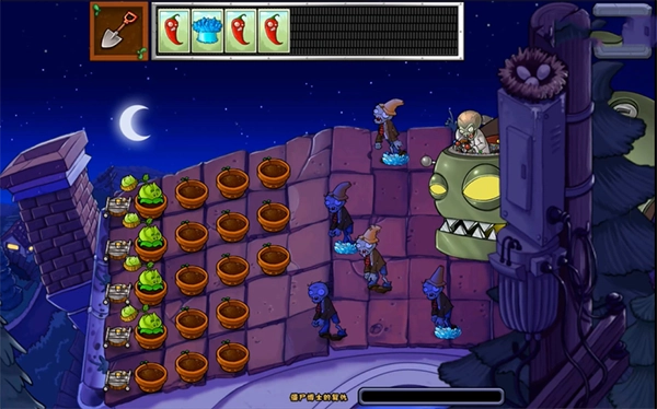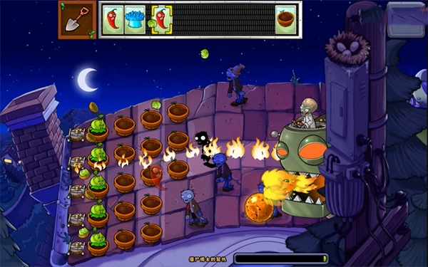 5、这里的僵尸能够操控大型机器人,进而投放僵尸;植物则会从上方移动过来,你需要把它们栽种到这里的花盆里,而不是像以前那样种在一块块的草坪上。
