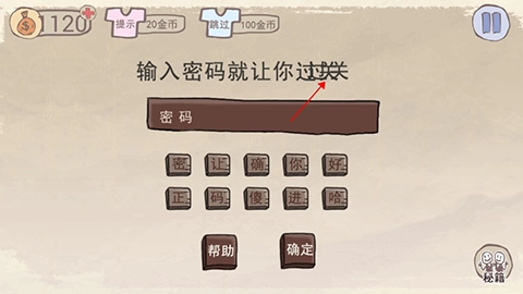 输入“密码”后,别点确定,只要点击“让你过关”里的“过关”两个字,就能顺利通关啦。哈哈,真是坑人啊!