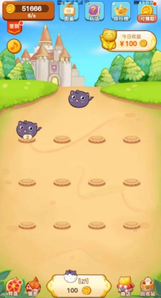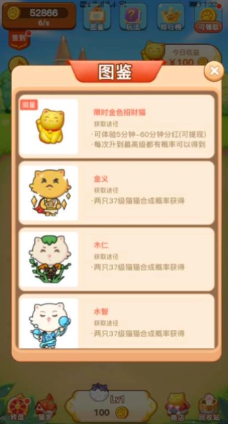 1、玩家可通过签到、抽奖等途径获取金币,用金币购买低等级猫咪,再把同等级的猫咪合成升级为更高等级的猫咪。