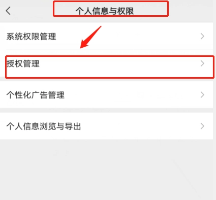 2、进入设置界面后,在【隐私】栏目里找到“个人信息与权限”选项,点击进入该选项后打开其中的“授权管理”。